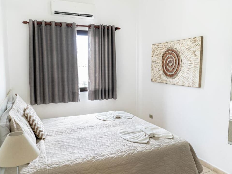Este encantador apartamento possui janelas amplas, cama box King Size, cama auxiliar de solteiro e ar-condicionado. A sala conta com sofá-cama, TV a cabo, mesa com 4 cadeiras e ventilador de teto. A cozinha americana tem micro-ondas e frigobar. Além disso, há banheiro, mini lavanderia e Wi-Fi. Todas as tomadas são 220w. Os apartamentos ficam no primeiro e segundo andar, oferecendo privacidade e conforto.